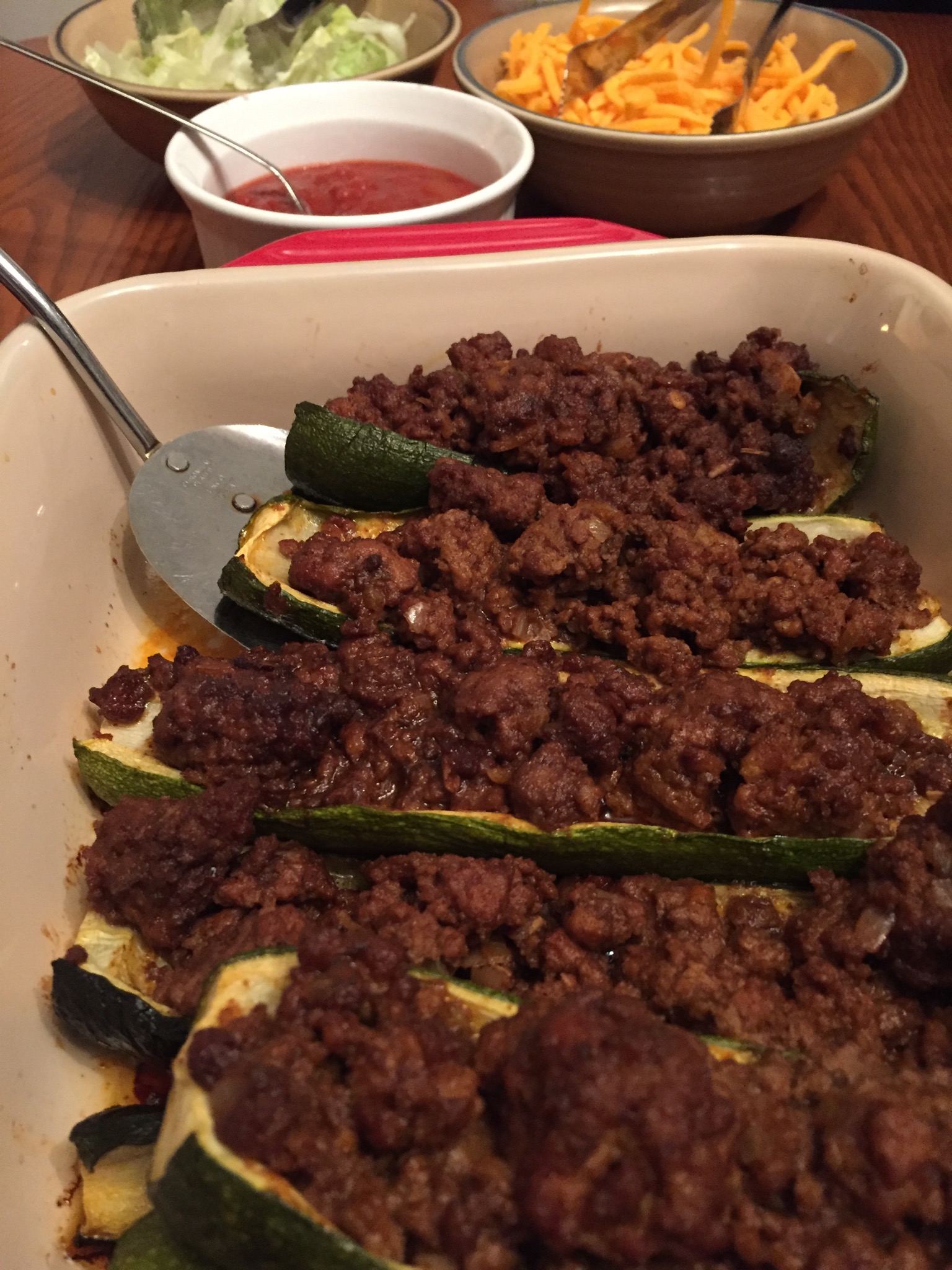 - In a skillet, brown ground lamb with taco seasoning. Set aside for placing into zucchini boats.